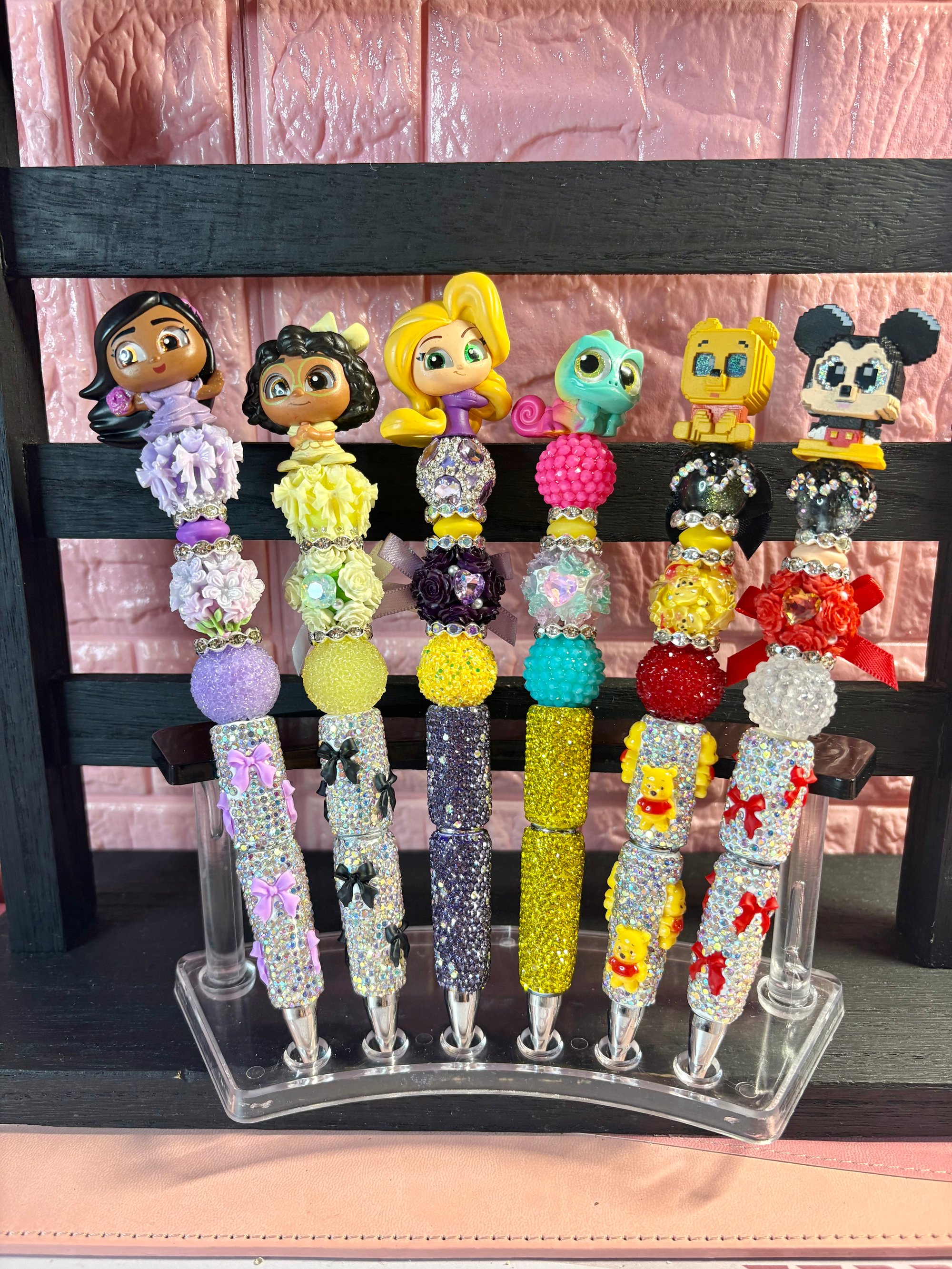 Add sparkle to your workspace with these handcrafted Disney-inspired beaded bling pens. Each pen is uniquely designed with layered resin beads, rhinestone spacers, textured bubble beads, and high-shine crystal barrels for a bold, luxury finish. Topped with adorable character figurines including princess favorites and iconic classics, these pens are both functional and collectible.