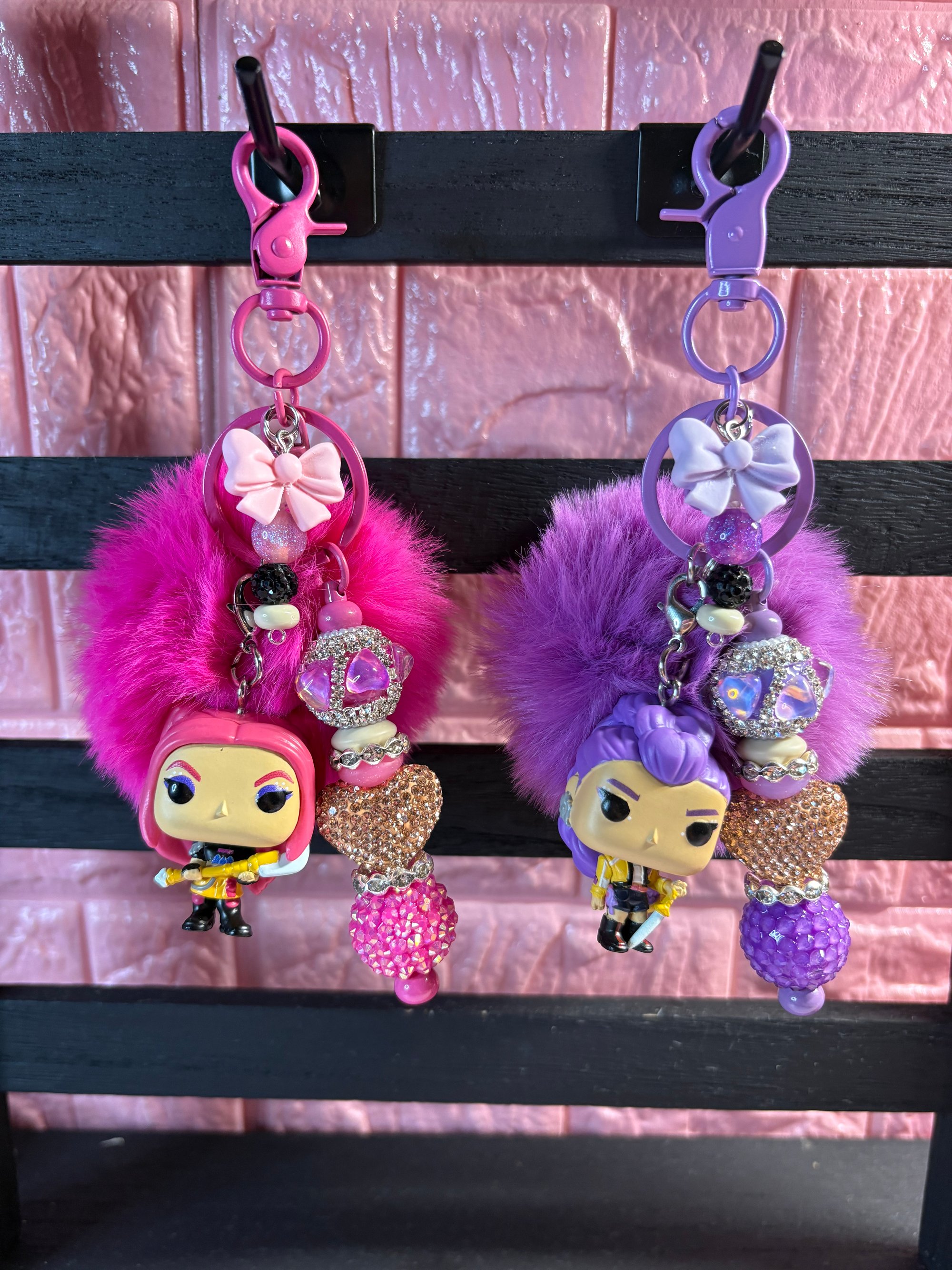 Inspired by the bold energy of K-Pop Demon Hunters, these handcrafted glam keychains are made for true fans who love statement accessories. Each piece features a collectible-style character charm paired with luxe rhinestone beads, sparkling heart accents, crystal detailing, satin bow charm, and an oversized faux fur pom for that dramatic stage-ready vibe.