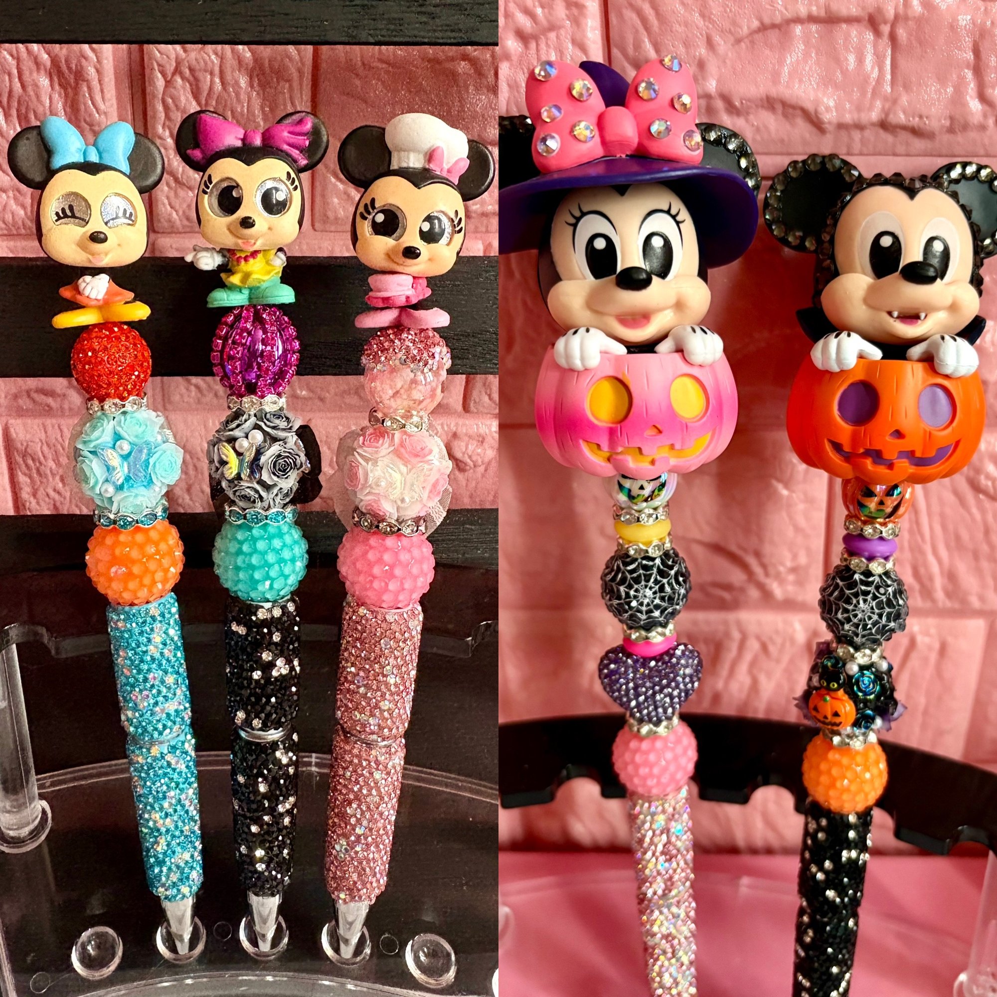 Add a little spooky sparkle to your writing! These adorable Halloween pens feature Mickey and Minnie in festive pumpkin designs, decked out with dazzling beads and rhinestone accents. Each pen is handmade with love β perfect for Disney fans, collectors, or anyone who loves a cute seasonal touch.