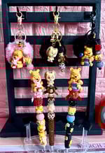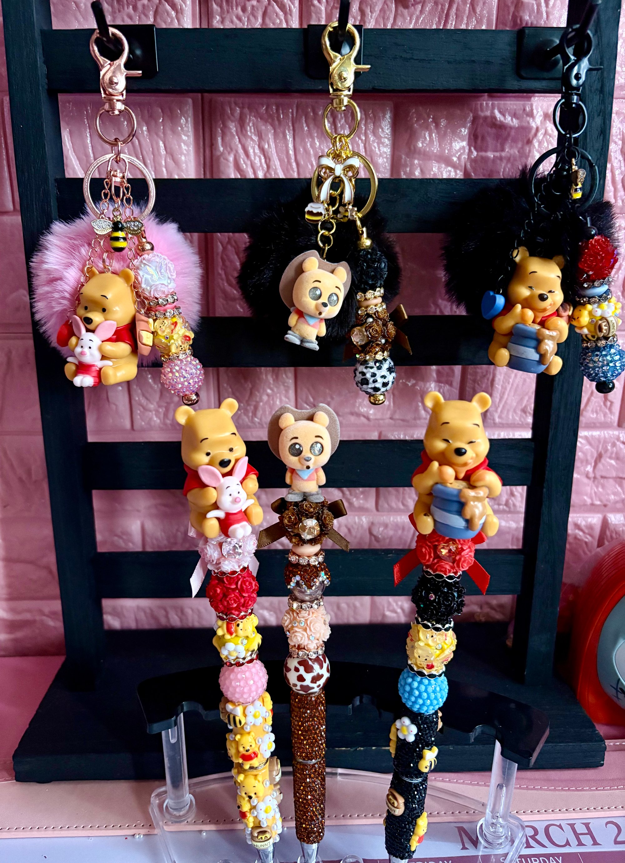 The bling pen features a smooth writing experience wrapped in layered decorative beads, including florals, honey-inspired accents, and signature Pooh elements for a unique, eye-catching finish. Paired with a coordinating keychain, complete with plush pom accents, charms, and gold or rose gold hardware, this set is both functional and fashionable.